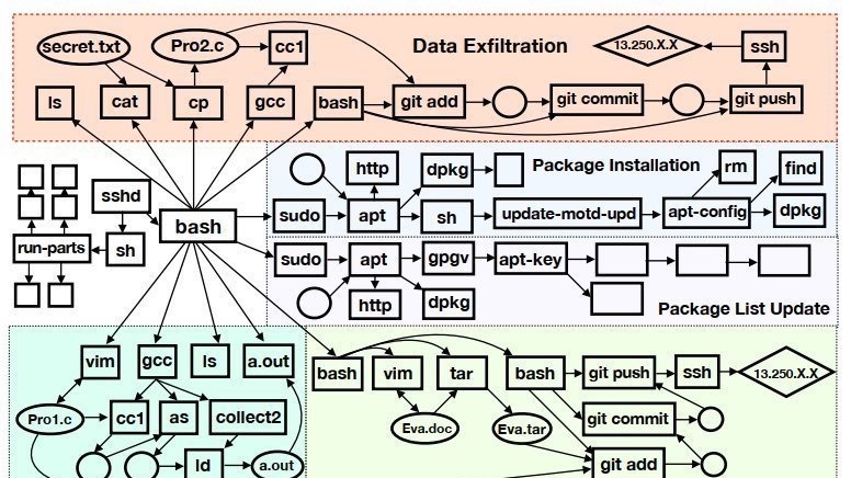 首先来简单介绍该场景。企业内部员工想利用自己的权限窃取一些敏感信息,他的工作是软件测试工程师。该员工的日常工作包括使用git同步代码,使用gcc来编译源代码,使用apt命令安全相关的测试依赖包。如果该员工想窃取敏感文件(),为了躲避检测,他需要模拟他的日常工作行为模式。首先该员工把敏感文件复制到该员工常用的工作目录中并重命名为pro2.c文件。然后,对该文件利用gcc进行编译,当前这个文件本身不是一个有效的源文件因此编译结果是不成功的,但是这不影响。该步只是为了模拟他日常工作行为模式。最后,该把该文件上传到了github上。该企业员工试图通过这种策略来窃取敏感数据。