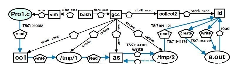 为了对攻击行为进行有效的因果分析,当前已有的方法主要是基于审计日志构建有效的溯源图[6]来进行分析。本质上溯源图是一个系统行为的因果关系的通用表示方式。图1 即是上面场景的溯源图。边的方法表示不同实体之间的数据流向。在攻击调查过程中,分析人员对溯源图进行分析来找到与攻击相关的信息片段。在图1的实体中,分析人员首先会根据一个确定的事件进行后向溯源来找到攻击的起源。然而,分析人员也可以利用前向溯源技术,从确定的攻击事件来确定其攻击后果。利用溯源技术,安全分析人员不仅能推断该攻击事件的根因与攻击结果,还能给出高层的抽象行为。